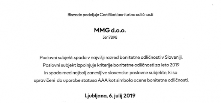 Naše podjetje je tudi v letu 2019 prejelo certifikat bonitetne odličnosti AAA. Določanje bonitetne odličnosti poteka na podlagi podatkov, ki so pod drobnogledom dnevno, saj se poslovanje podjetja in vplivi ključnih dejavnikov na uspešnost poslovanja, likvidnost ter politiko poslovanja poslovnega subjekta preverjajo na dnevni ravni.
